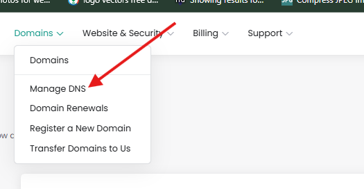 To access our DNS Manager, from the Client Area top navigation bar, click on the "Domains" link and from the dropdown bar select "Manage DNS":