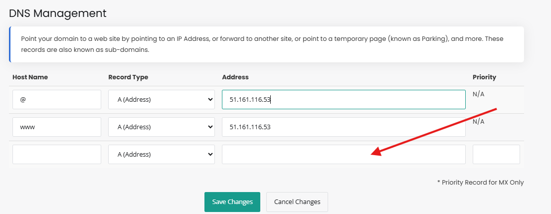 Note that you will be prompted to specify a default IP address for the DNS Zone when you add it. This IP address should be provided by your service provider. If you don't know what IP address to specify, you can specify our default IP address of 51.161.116.53. This can be changed later at any time.