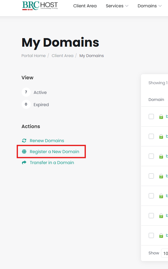 From the Client Area, click Domains: